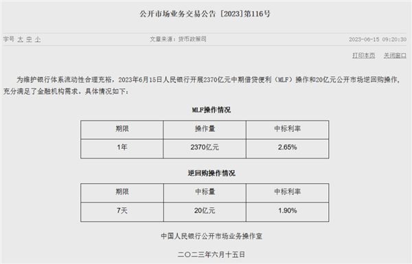 6月15日,人民银行发布消息称,为维护银行体系流动性合理充裕,人民银行开展2370亿元中期借贷便利(MLF)操作和20亿元公开市场逆回购操作。MLF利率下调10个基点至2.76%,7天期逆回购利率在日前已调降10个基点至1.90%。