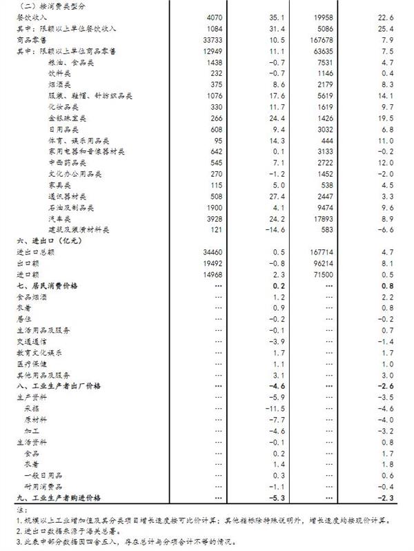 (4)社会消费品零售总额统计范围是从事商品零售活动或提供餐饮服务的法人企业、产业活动单位和个体户。其中,限额以上单位是指年主营业务收入2000万元及以上的批发业企业(单位、个体户)、500万元及以上的零售业企业(单位、个体户)、200万元及以上的住宿和餐饮业企业(单位、个体户)。
