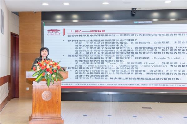 上海财经大学信息管理与工程学院韩冬梅教授发表了以“音频中的情感信息对分析师跟进行为的影响”为主旨的演讲。韩冬梅教授首先提出,有效市场假说不足以解释各类市场异象,行为金融学催生情感分析的相关研究。以证券分析师和投资者互动为对象,她认为投资者更倾向于从证券分析师处获取“加工好的信息”,即证券分析师所发布的评级报告。以音频数据为研究载体,韩冬梅教授研究了“音频会议中三个环节的情绪与分析师发布评级报告的关系”,包括音频会议中三个环节的情绪与分析师发布评级报告的意愿关系、与分析师发布评级报告中的评级关系、与分析师评级调整的关系。在演讲的最后,韩冬梅教授强调,相比现有研究采用分词等方法对文本数据进行情感分析,使用深度学习模型对音频直接进行情感信息的提取,并检验其对分析师行为的影响,对于市场参与主体具有十分重要的意义。