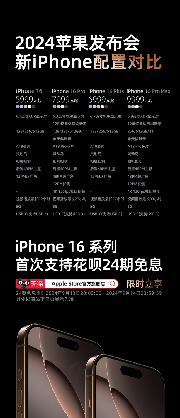 今日,苹果最新iPhone16系列发布。该系列四款机型将于9月13日20时起,在苹果天猫期舰店首发预售,预售前28小时,支持花呗24期分期免息购买。这是苹果首次在发新期间支持花呗24期分期免息。以基础128G款iPhone16为例,消费者使用花呗24期分期免息购买,每个月仅需支付约250元。