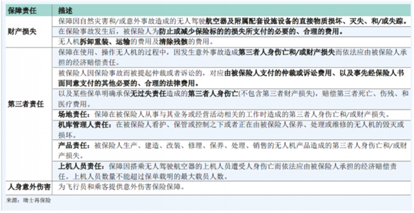 根据分析,当前,中国低空经济相关保险产品普遍针对下游航空器使用与运营服务领域,主要覆盖传统保险责任,通常不含特殊风险。在保险标的方面,国内保单不仅覆盖航空器,也覆盖附属设施。在保障责任方面,主要包括无人机财产损失、无人机第三者责任、人身意外伤害;通常不含电池、遥控的损坏及无人机日常维修相关责任。