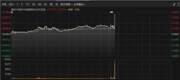 富时中国A50指数期货突然直线拉升,截至发稿,上涨0.59%。