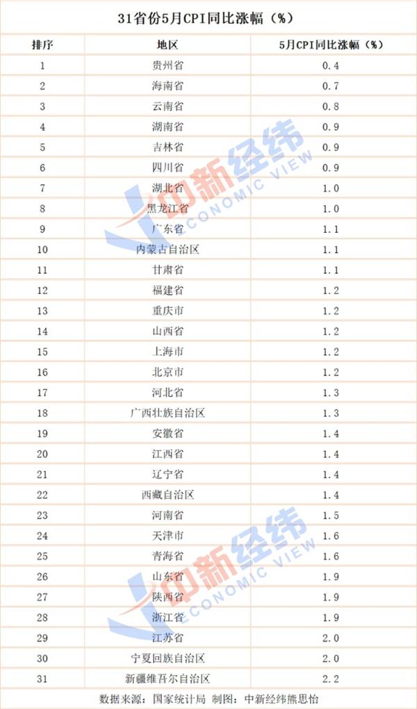 (原标题:31省份5月CPI揭晓:16地低于全国 贵州涨最少)