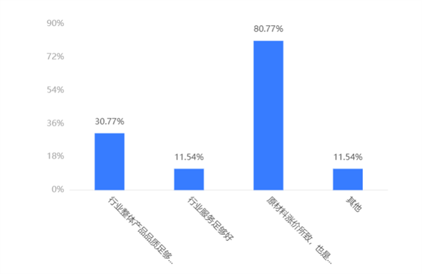 蓝鲸财经调查的数据显示,80.77%的消费者认为可以接受的原因是原材料涨价,涨价是发展的趋势。
