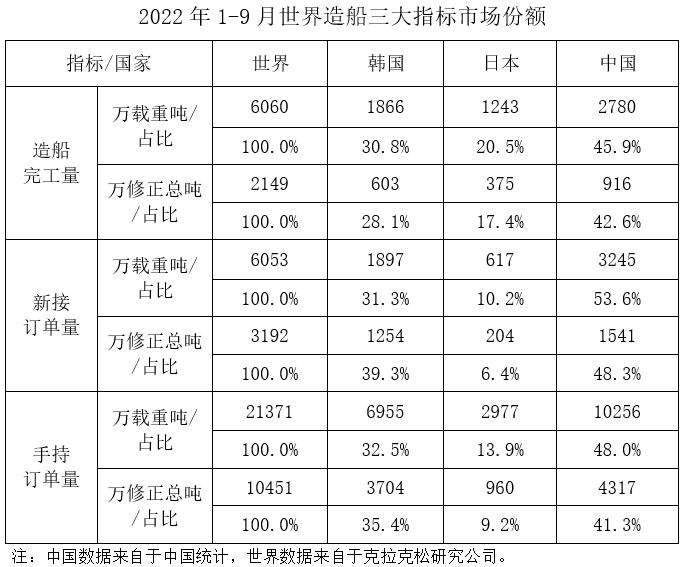 1~9月,我国造船完工量、新接订单量、手持订单量分别占世界市场份额的45.9%、53.6%和48%。
