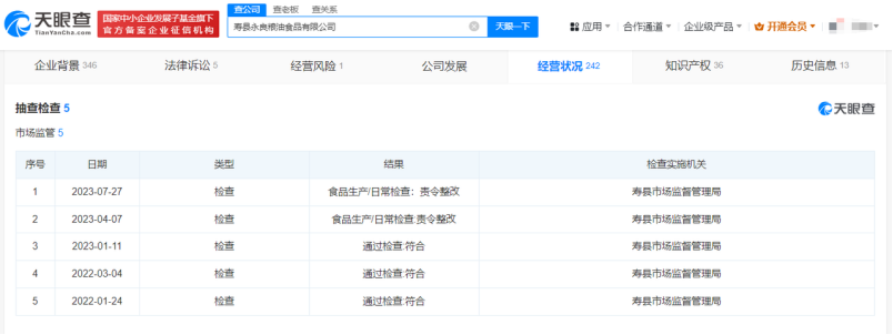 天眼查行政处罚信息显示,2023年4月13日,寿县永良粮油食品有限公司因虚假宣传被淮南市市场监督管理局罚款200万元。处罚事由显示,当事人为了获得市场竞争优势,提高大米销量,将寿县稻谷生产的大米宣称“二代泰国香米”,且以普通大米价格进行销售吸引消费者,使消费者将购买的寿县产大米与泰国产大米混淆,误认为购买的是泰国大米。抽查检查信息显示,寿县市场监督管理局分别在2023年4月、7月对寿县永良粮油食品有限公司进行2次抽查检查,结果均为“责令整改”。