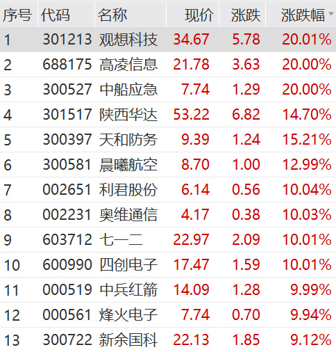 个股方面,观想科技、高凌信息双双走出20CM涨停,利君股份、奥维通信、七一二、四创电子、中兵红箭等多股涨停。