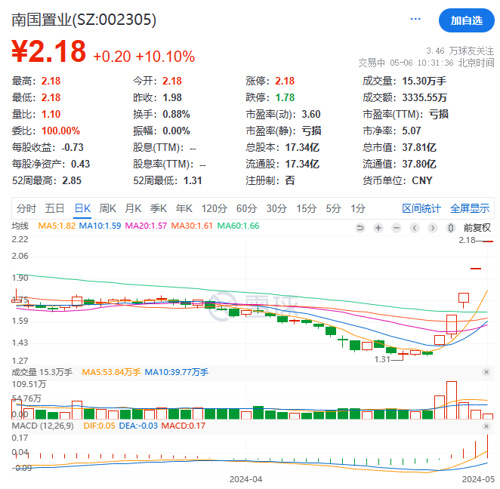 近期房地产板块持续迎来利好消息,个股表现踊跃。5月6日上午,地产股开盘走高,南国置业五连板,华远地产、阳光股份、我爱我家等多股涨停。