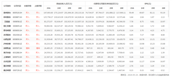 行业重点公司最新盈利预测综合值