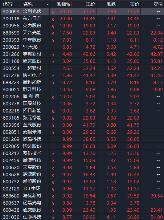 5月22日,A股三大指数走势分化,创业板指相对强势,个股表现活跃,两市上涨个股超过3100家。其中,光伏指数大涨近5%,金刚光伏、东方日升、拓日新能、晶澳科技等近30只概念股涨停或涨超10%。