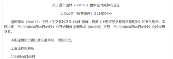 值得注意的是,由于股价跌幅巨大,截至发稿,上交所上午盘中对退市园城两次发布临时停牌公告。第一次临时停牌自9时30分开始,当日9时40分起恢复交易。