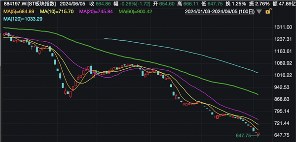 行情数据显示,今日开盘,万得ST板块指数进一步下跌,一度刷新该指数发布以来的新低,不过随后跌幅有所收窄,似乎出现“刹车”迹象。此前,该指数已连续7个交易日下跌,年初至今该指数已接近“腰斩”。