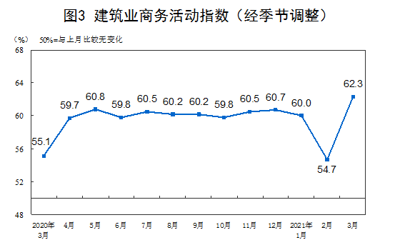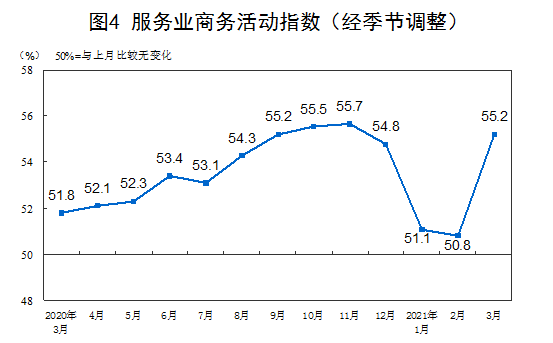 3月份,综合PMI产出指数为55.3%,比上月上升3.7个百分点,表明我国企业生产经营活动总体加快。