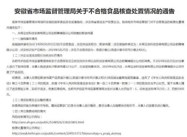 其中,永辉云创科技安徽有限公司合肥藕塘路分公司销售的散装鸡蛋抽查不合格。合肥市庐阳区市场监督管理局于2019年6月25日对永辉云创科技安徽有限公司合肥藕塘路分公司进行了现场检查,该公司购进该批次散装鸡蛋22.5公斤,已全部销售完毕。2019年6月25日,永辉云创科技安徽有限公司合肥藕塘路分公司开展了产品召回。