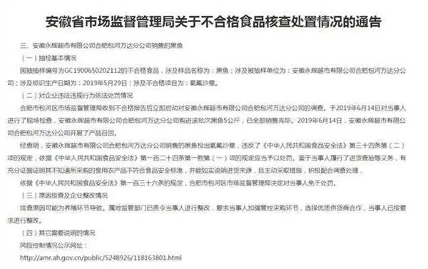 安徽永辉超市有限公司合肥包河万达分公司销售的黑鱼抽查不合格。合肥市包河区市场监督管理局于2019年6月14日对安徽永辉超市有限公司合肥包河万达分公司进行了现场检查,该公司购进该批次黑鱼5公斤,已全部销售完毕。2019年6月14日,安徽永辉超市有限公司合肥包河万达分公司开展了产品召回。该批次黑鱼国抽抽样编号为GC1900650202112;涉及标识生产日期为:2019年5月29日;涉及不合格项目为:氧氟沙星。