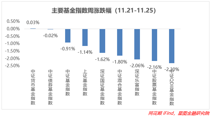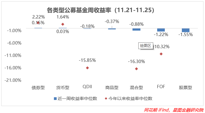 上周债券型基金收益率中位数最高,经过前期的大幅下跌,周内预期有所改善,而且多数债基关闭赎回通道,也减弱了挤兑的影响,周收益率中枢由跌转涨,环比改善也是最大的,周环比+0.62pct;股票型、FOF型基金受股票、底仓基金影响比较大,领跌所有基金,环比分别-4.26pct、-1.37pct,而QDII型基金环比降幅最大达到了-4.63pct;其余类型基金跌幅都在-1%到0%之间;货币型基金继续积累收益。