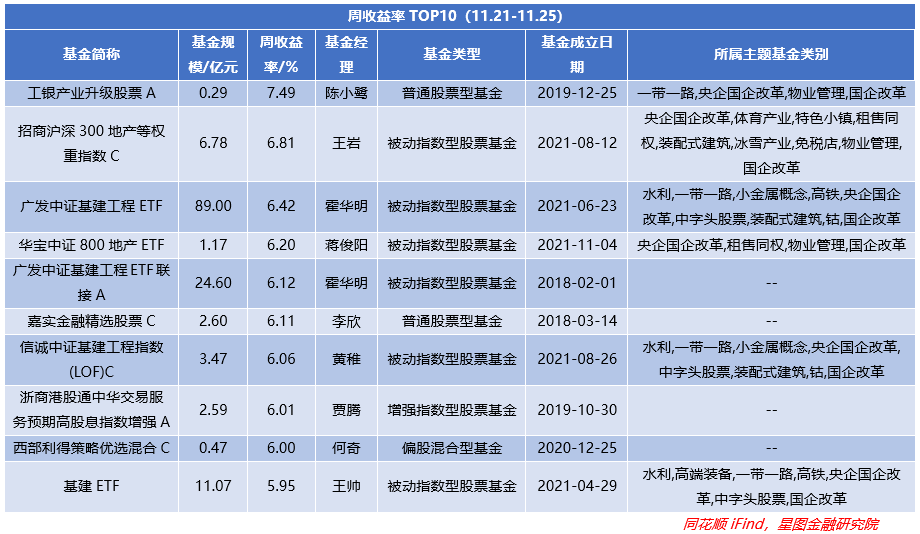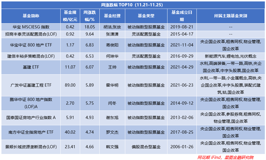 从涨跌幅(A/C基金以A类或排名靠前为准,QDII美元/人民币以排名靠前为准)TOP10来看,被动指数型基金同样为7只,剩余3只均为主动权益型基金;且相关基金也主要是地产、央国企改革、中字头股票。整体涨幅则出现下滑至-1.51%,环比-2.29pct,由正转跌。最高涨幅大增6.59pct至18.05%,为华宝基金旗下基金。