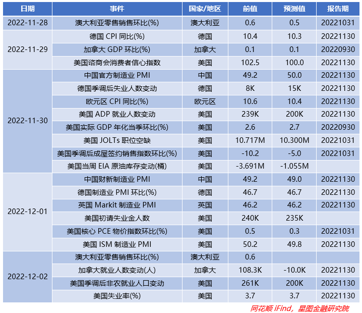 上周A股中三大指数分歧较大,上证指数在震荡中小幅向上,深证成指和创业板指则继续回调,而且成交量创出近1月新低,或许是“世界杯魔咒”的影响,此外也仅有上证指数依然在60日均线附近,剩余两大指数均进一步走低,周内新上线的北证50指数表现不错,从9月以来呈现“W”走势,且连续5个交易日在60日均线上方,专精特新属性标的前景广阔。而在周内证监会提出要探索建立具有中国特色的估值体系,促进市场资源配置功能更好发挥,此外国常会提出适时适度运用降准等货币政策工具,保持流动性合理充裕,对国内A股有极大利好。疫情方面,周内国家卫健委提出要准确划分风险区域,精准防控,严防层层加码,尽量缩小疫情的影响,截至11月27日周内新增本土确诊病例达22555例,日均增量峰值接近4000例,环比增加57%。