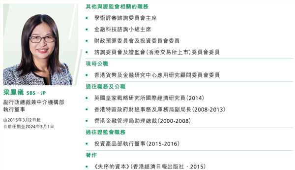 公开信息显示,2015年3月,梁凤仪正式加入香港证监会担任执行董事,掌管投资产品部,并于2016年接任为中介机构部执行董事,2018年3月获委任为副行政总裁。