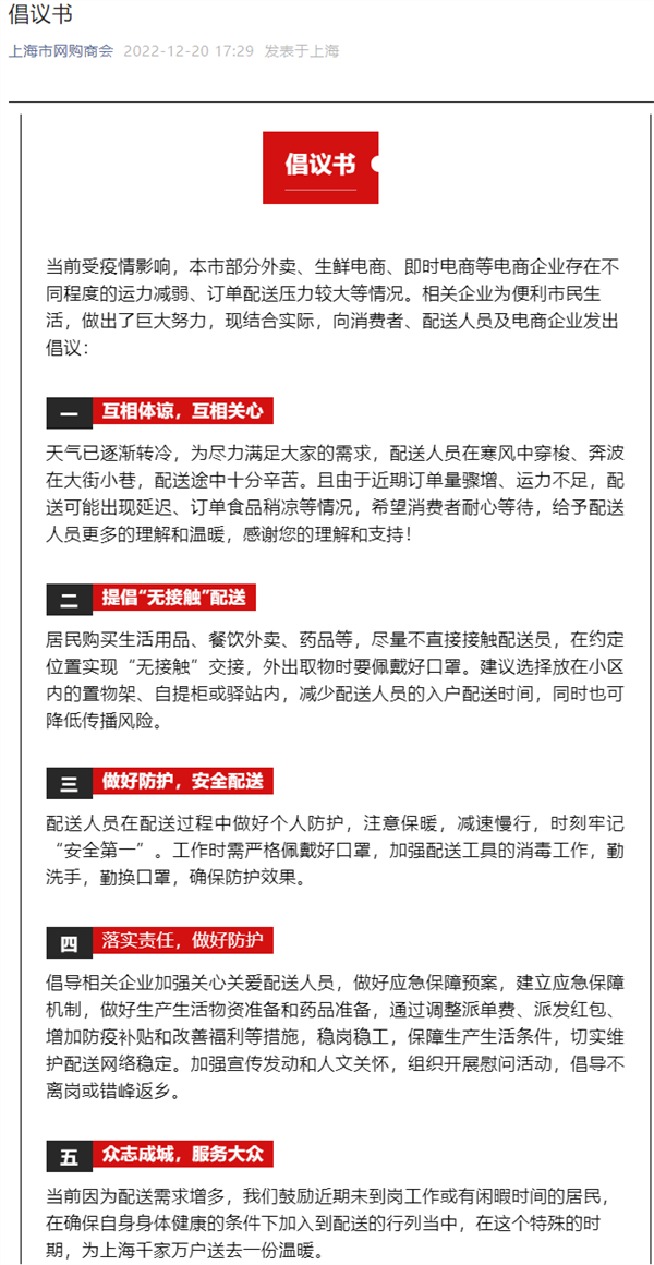 上海市网购商会发布倡议书,当前因为配送需求增多,我们鼓励近期未到岗工作或有闲暇时间的居民,在确保自身身体健康的条件下加入到配送的行列当中,在这个特殊的时期,为上海千家万户送去一份温暖。