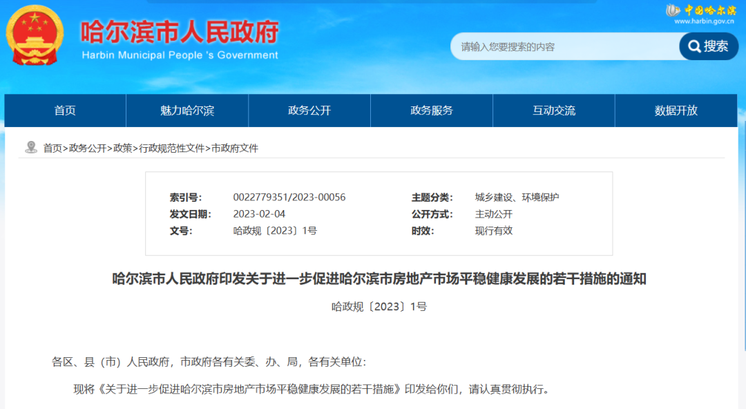 2月6日,哈尔滨市发布《关于进一步促进哈尔滨市房地产市场平稳健康发展的若干措施》,涵盖了支持首套及第二套合理购房需求、购房补贴、公积金、土地规划、宣传推广、金融扶持等方面共20条政策措施。