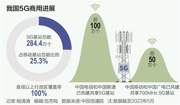 根据中国信通院披露的数据显示,截至今年5月份,我国5G基站总数达到284.4万个,占移动基站总数的25.3%,县级以上行政区覆盖率达100%,实现“县县通5G”。其中,中国电信和中国联通已共建共享5G基站超100万个,中国移动和中国广电已共建共享700MHz 5G基站超50万个。