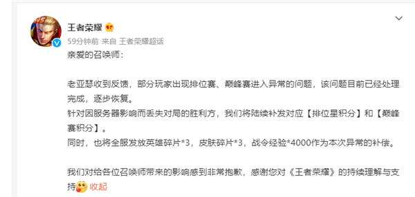 针对因服务器影响而丢失对局的胜利方,将陆续补发对应“排位星积分”和“巅峰赛积分”。