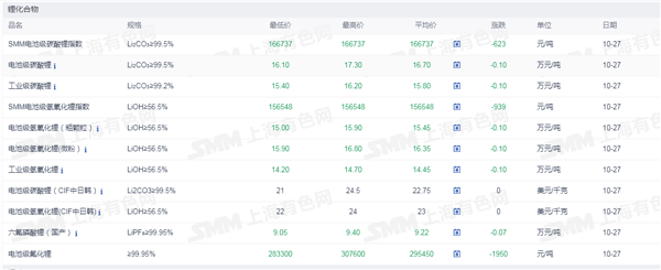 证券之星新能源车行业周报:据上海有色网,截止10月27日,电池级碳酸锂16.10- 17.30万元/吨,均价16.70万元/吨,环比上一工作日下滑0.10万元/吨;工业级碳酸锂15.4-16.2万元/吨,均价15.80万元/吨,环比上一工作日下滑0.10万元/吨。目前市场整体看跌情绪依旧浓重,下游企业仍以长协为主,零单采买意愿平淡,部分贸易商,盐厂出货压力较大,挺价心态动摇,价格小幅走低。